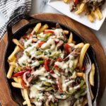 - Assemble the Fries: Spread the cooked fries on a serving platter. Evenly distribute the steak, pepper, and onion mixture over the fries. Pour the warm cheese sauce generously over the top. Serve any remaining cheese sauce on the side for dipping.