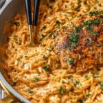 This Creamy Orzo With Chicken is a comforting one-pan meal featuring tender seared chicken breasts cooked with orzo pasta in a savory blend of garlic, white wine, chicken broth, and Italian seasoning, finished with creamy heavy cream, parmesan cheese, tomato paste, and fresh baby spinach for a rich and satisfying dinner ready in just 30 minutes.