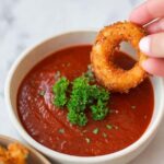 This Easy Fried Calamari with Spicy Marinara recipe features tender calamari rings marinated in milk, coated in a seasoned flour mixture, and fried to golden perfection. Served with a homemade spicy marinara sauce made with garlic, crushed tomatoes, and a blend of herbs and chili flakes, this dish is a delightful appetizer or light main course packed with flavor and crisp texture.