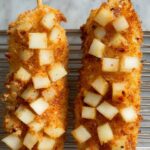 These Korean Corn Dogs, also known as Gamja Hotdog, feature cheese-wrapped beef franks encased in a yeasted batter mixed with seasoned shredded potatoes, coated with panko crumbs, and fried to a crispy golden perfection. Served with classic ketchup, mustard, and a sprinkle of sugar, these corn dogs offer a delightful combination of crunchy exterior and gooey, savory interior, perfect for a savory snack or casual meal.