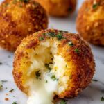 Crispy Fried Potato Cheese Balls are a delicious party snack featuring creamy mashed potatoes mixed with bacon and seasoning, stuffed with melted mozzarella cheese, coated in a crunchy panko breadcrumb crust, and fried to golden perfection. Perfectly crispy on the outside and gooey on the inside, these bite-sized treats are served warm with marinara dipping sauce.
