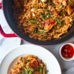 This One Pot Ginger Chilli Chicken Orzo is a flavorful and easy weeknight meal that combines tender chicken thighs with aromatic ginger, garlic, and chili flakes, all cooked together with orzo pasta in a savory Asian-style sauce. Finished with a drizzle of chili oil and sweet chili jam and garnished with fresh scallions and cilantro, this dish is perfect for a quick, satisfying dinner that everyone will love.