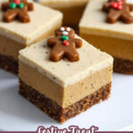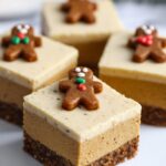 - Chill and Serve: Refrigerate the cheesecake for 2 hours to overnight to fully set. Remove from the pan using the parchment overhang and cut into 12 bars. Optionally, garnish with mini gingerbread cookies or sprinkles before serving.