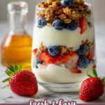 Freezing isn’t ideal for this parfait since yogurt and fresh berries don’t freeze well together—the texture becomes watery once thawed. If you want to prep in bulk, keep ingredients separate and assemble fresh.
