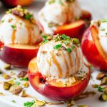 - Assemble Dessert: Once peaches are warm and handled safely, plate each half. Top with a scoop of vanilla ice cream, drizzle with caramel sauce, then sprinkle with roasted pistachios, fresh mint, and a pinch of finishing salt.