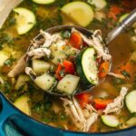 - Finish the soup: Add the canned diced tomatoes, sliced zucchini, and the 8 cups of chicken stock. Bring the mixture to a boil and cook for 20 minutes or until potatoes are tender. Meanwhile, shred the rested chicken and stir it back into the soup just until warmed through.