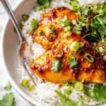 This Sheet Pan Baked Honey Garlic Chicken Thighs recipe features juicy chicken thighs roasted to perfection with a sweet and savory honey garlic glaze. Served over a bed of rice and garnished with fresh green onions, cilantro, and a squeeze of lime juice, this dish is perfect for a flavorful weeknight dinner or meal prep.