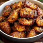 Delicious Hot Honey Salmon Bites featuring bite-sized salmon pieces seasoned with paprika, garlic, and onion powder, air-fried to perfection, and tossed in a sweet and spicy hot honey butter glaze. Perfect as an appetizer or main course with a fresh parsley garnish.