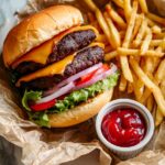 This Classic Cheeseburger Recipe features juicy grilled ground beef patties topped with melted cheddar cheese, fresh lettuce, ripe tomato slices, and onions, all served on a soft hamburger bun with a tangy homemade burger sauce. Perfect for a delicious and satisfying homemade burger experience.