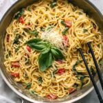 This One Pan Pasta recipe delivers a delightful and easy meal with linguine, cherry tomatoes, baby spinach, onion, garlic, and fresh basil all cooked together in one pan. Finished with optional Parmesan cheese, it's perfect for a quick, flavorful, and convenient dinner.