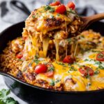 A flavorful and easy one-pot BBQ chicken and rice dish featuring tender chicken thighs cooked with BBQ sauce, vegetables, and rice in a savory chicken stock, topped with melted cheese and fresh avocado, tomatoes, and herbs for a complete and satisfying meal.