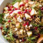 A vibrant and festive Pomegranate Arugula Quinoa Salad featuring a mix of tangy pomegranate seeds, fresh arugula, crisp Gala apples, crunchy walnuts, creamy feta, and sweet dried cranberries, all tossed in a zesty balsamic Dijon dressing. Perfect for a healthy lunch or as a colorful side dish during holiday meals.