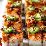 - Garnish and Serve: Cut the sushi bake into 12 to 24 pieces. Sprinkle furikake rice seasoning on top, drizzle eel sauce over each piece, and sprinkle chopped green onions. Add optional fresh garnishes like thin slices of cucumber, radish, jalapeño, or avocado as desired.