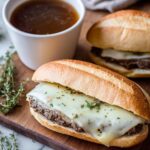 Enjoy the classic Slow Cooker French Dip Sandwiches with Au Jus featuring tender, flavorful beef chuck roast slow-cooked to perfection with onions and herbs, served on toasted French rolls with melty provolone cheese and a tangy horseradish mayo spread. Perfect for an easy and hearty meal with delicious dipping jus made from the savory broth.