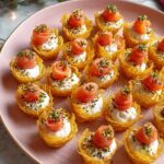 Mini Smoked Salmon Hash Brown Cups are crispy, golden hash brown bites shaped into mini cups, filled with creamy whipped Boursin cheese mixed with Greek yogurt and lemon, then topped with silky smoked salmon and everything bagel seasoning. Perfect as a festive brunch appetizer or party snack that combines smoky, creamy, and zesty flavors.