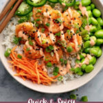 - Assemble bowls: Start with a base of cooked rice, then layer cucumber, jalapeño, carrots, edamame, and saucy shrimp.