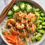 - Assemble bowls: Start with a base of cooked rice, then layer cucumber, jalapeño, carrots, edamame, and saucy shrimp.
