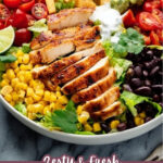 Store leftover chicken separately in an airtight container in the refrigerator for up to 3 days to keep it juicy and fresh. You can keep the salad base and toppings in another container but add the tortilla strips and dressing only when you’re ready to serve to maintain crunch and flavor.