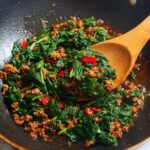 - Add the basil: Toss in the fresh holy or Thai basil leaves and stir-fry just until wilted.