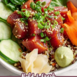 This Tuna Poke Bowl features fresh sashimi-grade tuna marinated in a flavorful ginger soy dressing, served over perfectly seasoned sushi rice with crisp vegetables and creamy avocado. A vibrant, healthy dish inspired by Hawaiian and Japanese flavors, perfect for a light yet satisfying meal.