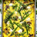 This Spring Asparagus Frittata is a vibrant and fresh brunch dish featuring tender asparagus, cremini mushrooms, fresh peas, spinach, and aromatic herbs, all baked with creamy Boursin cheese and eggs for a rich, flavorful meal.