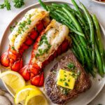 - Serve: Arrange filet mignon and lobster tails on plates, top each steak with a pat of compound butter, and garnish with lemon wedges. Serve immediately.