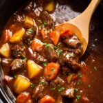This Slow Cooker Beef Stew is a comforting and hearty dish perfect for fall and winter. It features tender chunks of beef, golden Yukon gold potatoes, carrots, and peas simmered in a rich broth with red wine, onions, and garlic, resulting in a flavorful and satisfying meal.